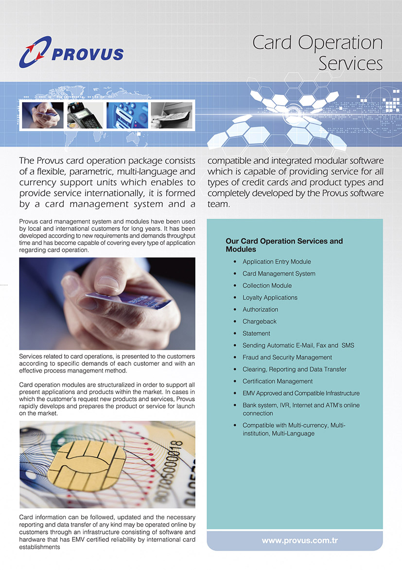 Provus Fuar Tanıtım Föyleri Pekçok Banka ve Şirkete; kişisel kart üreten, ekstre ve zarflama gibi pekçok hizmeti bünyesinde barındıran şirkete tanıtım föyleri hazırlanmıştır. Arapça ve Rusça dahil 4 dilde hazırlanmıştır.